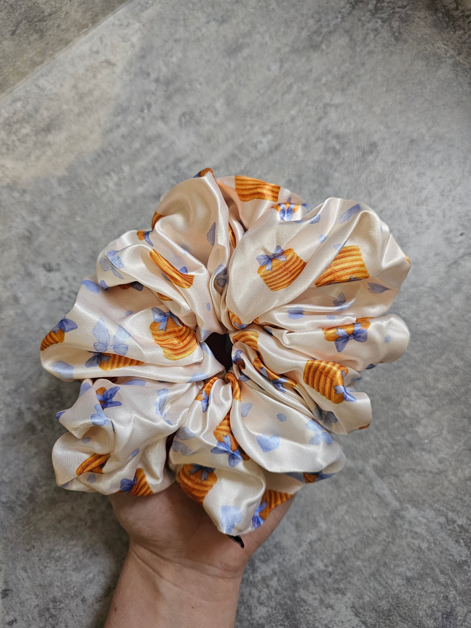 * Crafted from satin material, this scrunchie offers a sleek and smooth texture. It's designed to keep your hair in place while showcasing your love for beautiful hair accessories. The scrunchie's elegant design complements any outfit, making it a versatile addition to your accessories.