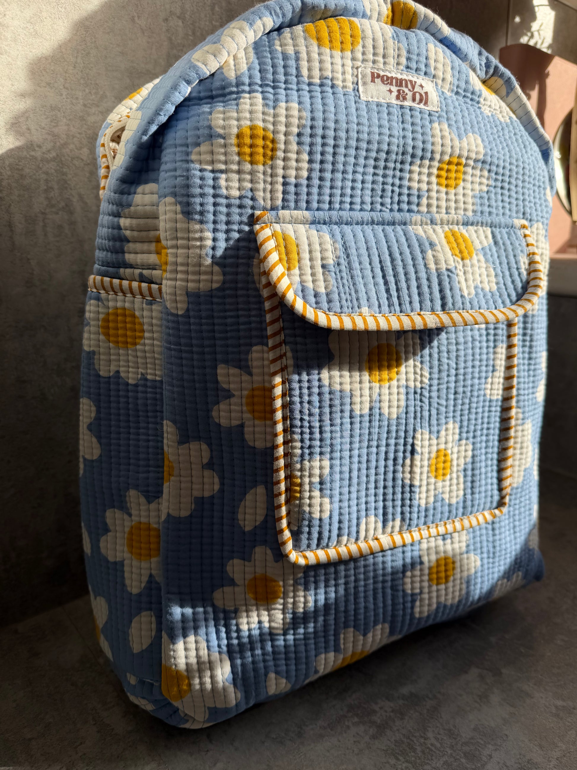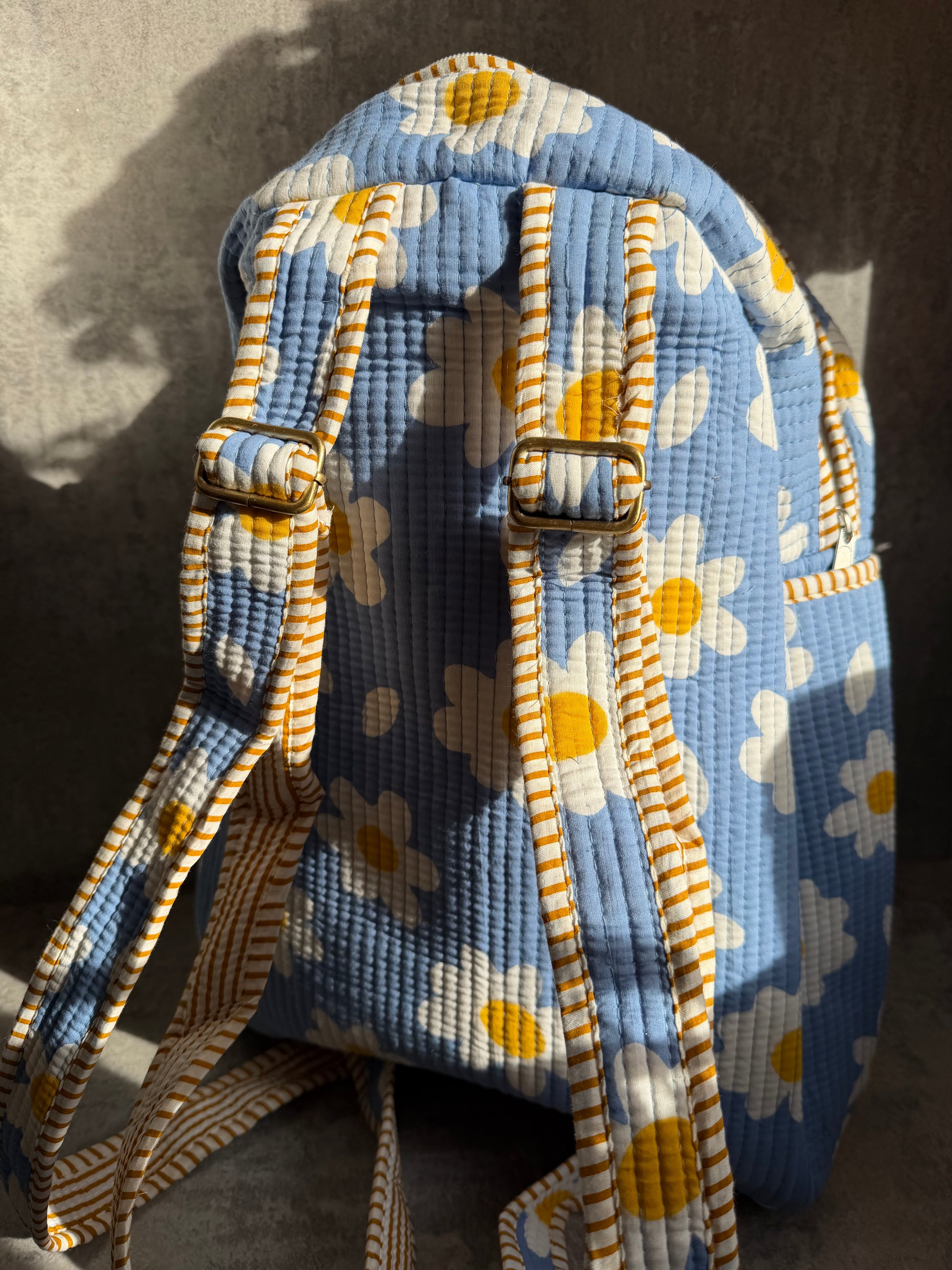 our handmade cotton backpacks are 18” tall, 15” wide and 7” deep, and nice roomy straps!