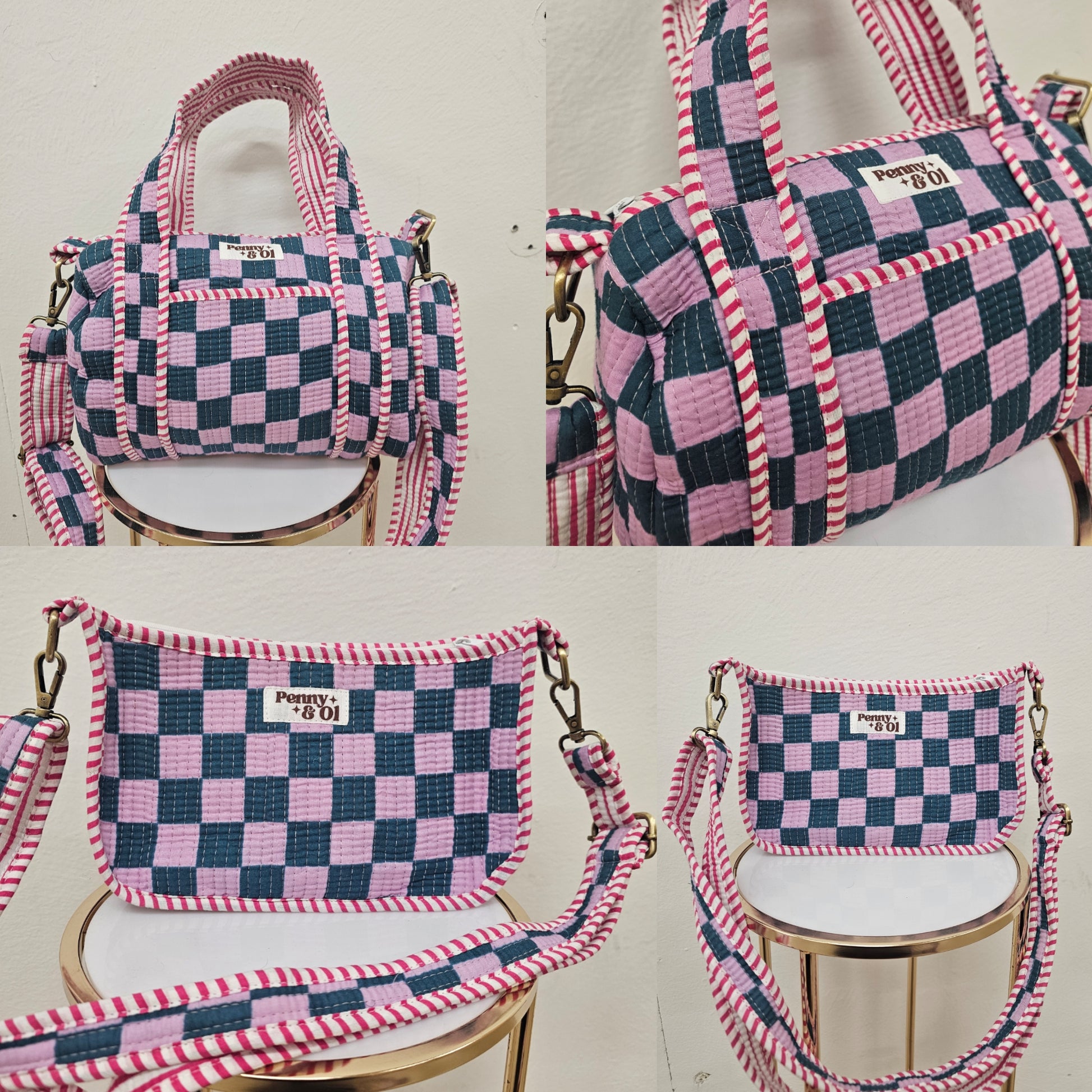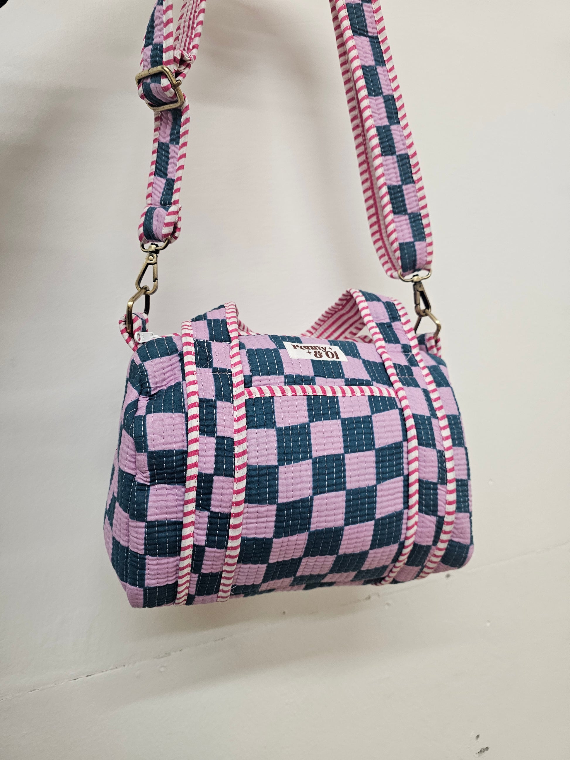 Mini duffle bag- approximately 12" wide, 9" tall and 7" depth. With extendable, removable cross body strap.