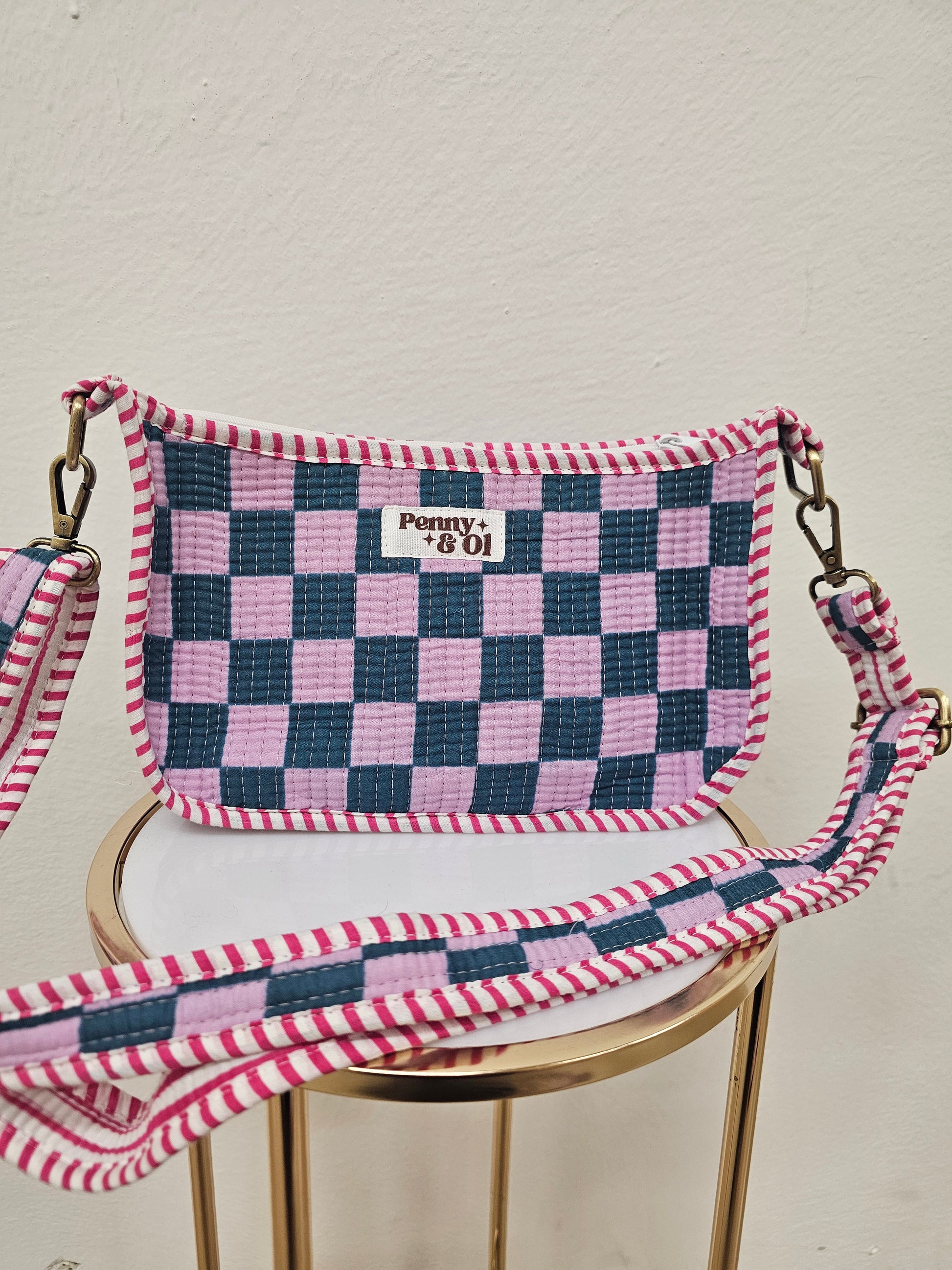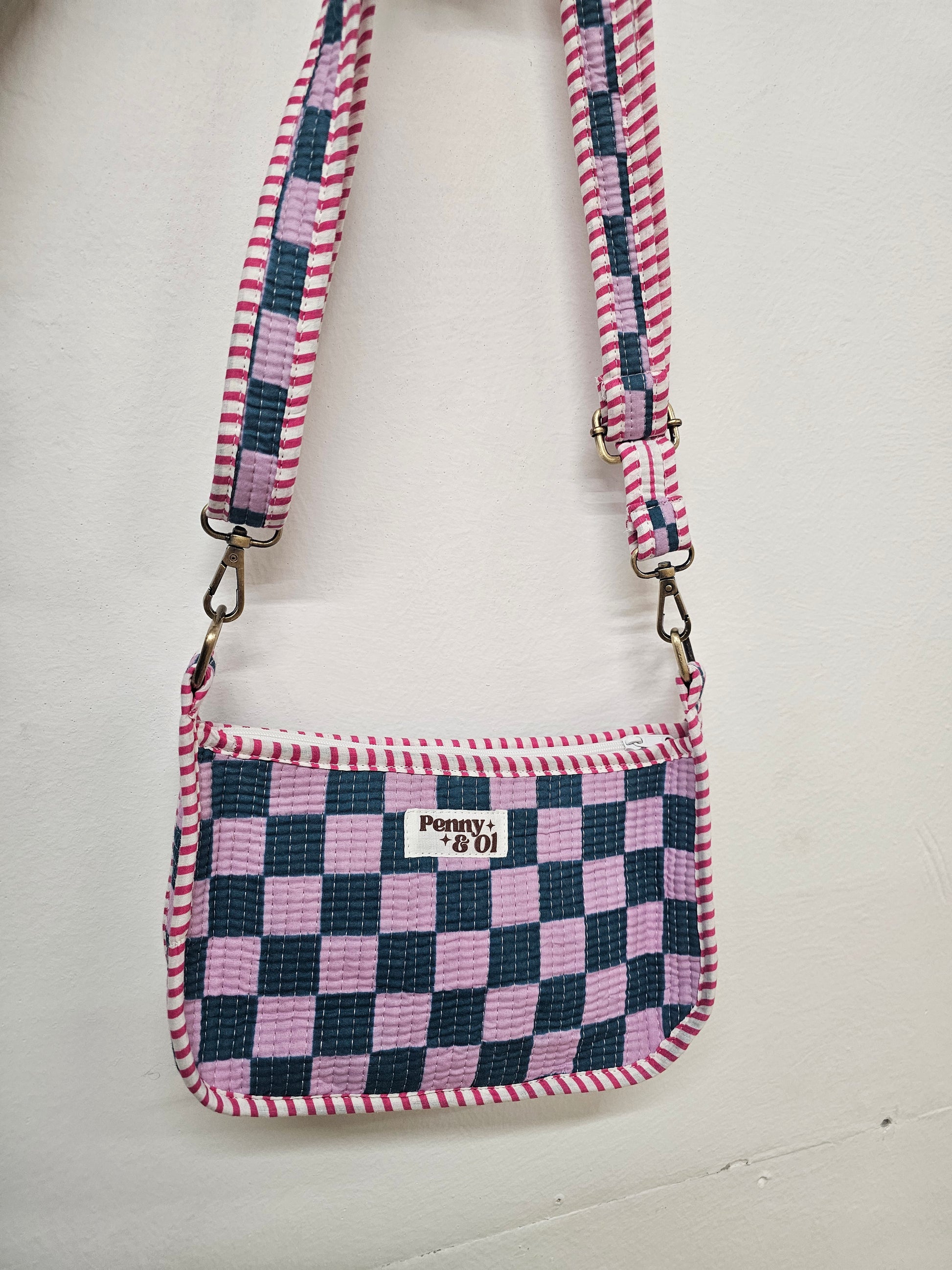 Mini shoulder bag- approximately 10" wide and 5" tall. With extendable cross body strap. Wear on the shoulder or across the body!